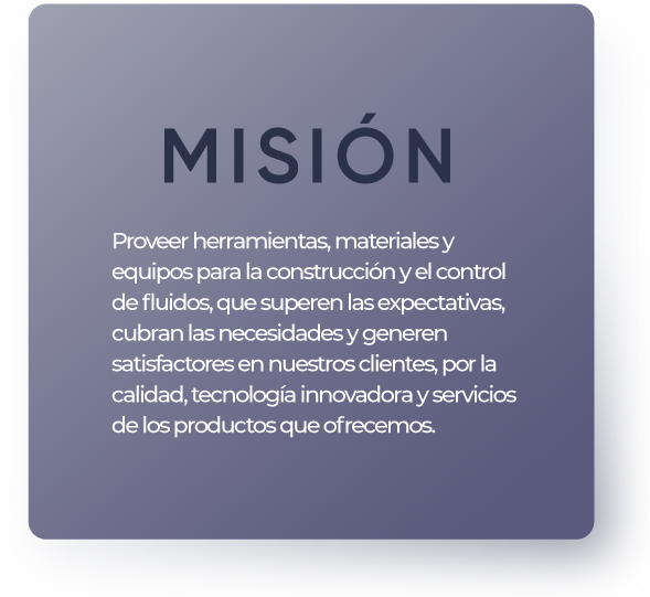 Proveer herramientas, materiales y equipos para la construcción y el control de fluidos, que superen las expectativas, cubran las necesidades y generen satisfactores en nuestros clientes, por la calidad, tecnología innovadora y servicios de los productos que ofrecemos.